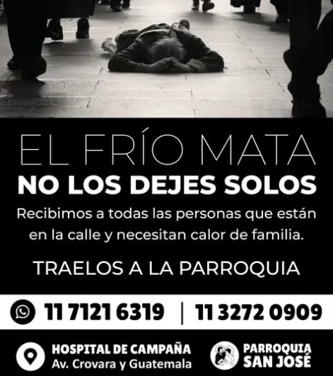 La Parroquia San José lanzó la campaña “El frío mata, no los dejes solos”, la cual llama a los vecinos y vecinas a acercar al Hospital de Avenida Crovara y Guatemala, de la localidad de San Justo, a quienes no tienen un hogar.