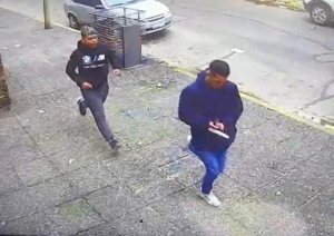 Los dos sospechosos quedaron registrados por una cámara mientras escapaban manipulando un arma de fuego. La vecina continúa internada y