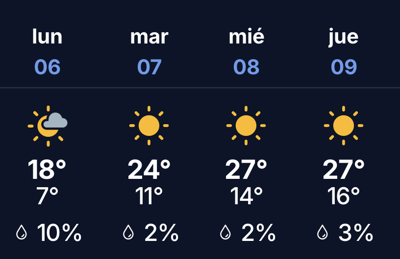 Martes 7: el martes se espera cielo ligeramente nublado en la mañana y algo nublado en la tarde. Mínima de 9° y máxima de 22°.