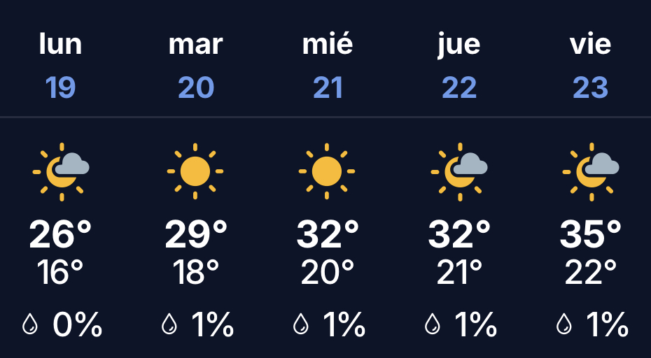 Viernes 23 de enero: el cierre de la semana tendrá cielo parcialmente nublado, con mínima de 22° y máxima de 35°, con vientos que soplarán desde el norte durante la madrugada y la mañana, mientras que por la tarde y la noche lo harán desde el este.