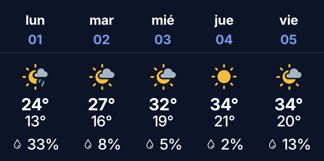 - Jueves 4: el jueves tendrá cielo algo nublado con una mínima de 20° y una máxima de 30°.