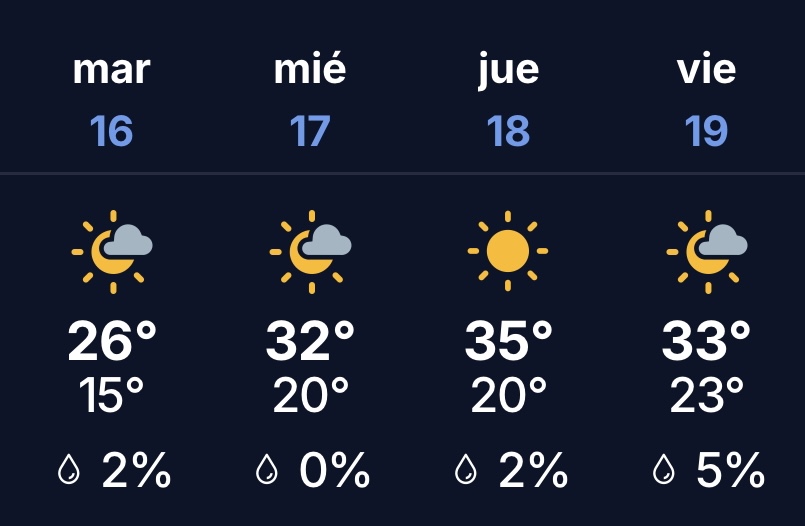 • Miércoles 17: para la mitad de la semana se espera una mínima de 17° y máxima de 29°, que pueden extenderse hasta las 32° con cielo algo nublado en la mañana y parcialmente nublado en la tarde y la noche.