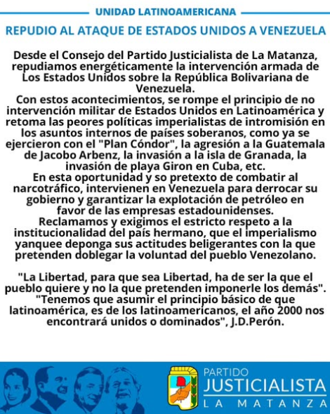 “Desde el Consejo del Partido Justicialista de La Matanza, repudiamos energéticamente la intervención armada de Los Estados Unidos sobre la República Bolivariana de Venezuela”, abre el comunicado.
