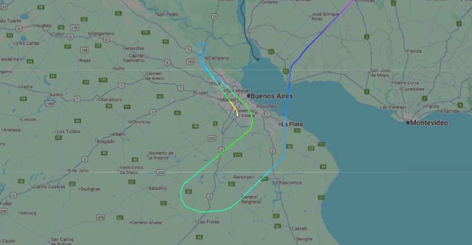 En lugar de dirigirse directamente hacia Ezeiza, voló hacia el suroeste, alcanzando zonas como Las Flores, para luego girar hacia el norte en un amplio recorrido que lo llevó a atravesar múltiples partidos bonaerenses. Entre ellos, según confirmaron distintos medios, se encuentran además de La Matanza, La Plata, General Belgrano, Saladillo, Roque Pérez, Lobos, Cañuelas, San Vicente, Presidente Perón, Esteban Echeverría, Lomas de Zamora, Exaltación de la Cruz, Campana y Zárate.