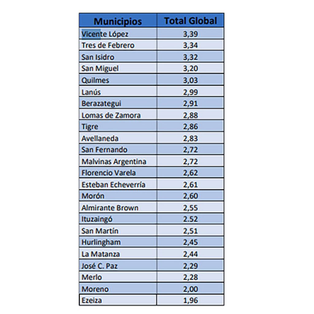 Los resultados destacan a Vicente López, que lidera el ranking con una puntuación de 3,39, seguida por Tres de Febrero (3,34), San Isidro (3,32), San Miguel (3,20) y Quilmes (3,03).