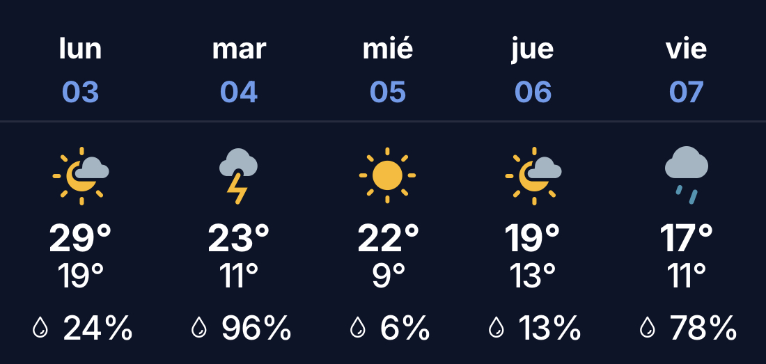 - Lunes 3: cielo algo a parcialmente nublado con mínima de 19° y máxima de 29°.