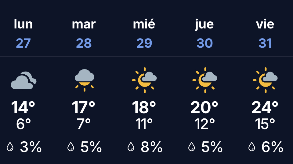 • Martes 28: cielo mayormente nublado durante todo el día con una mínima de 7° y una máxima de 17°.