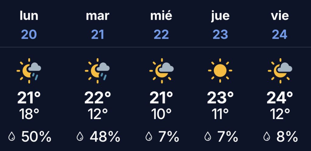 • Miércoles 22: para la mitad de la semana se espera cielo algo nublado durante todo el día con una mínima de 10 y una máxima de 21 grados.